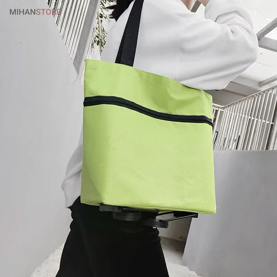 کیف خرید چرخدار تاشو دارای چرخ‌هایی است که به شما کمک می‌کند بدون اینکه وزن خریدتان را بر روی شانه‌ها یا دست‌های خود احساس کنید، خریدتان را به‌راحتی حمل کنید. برای استفاده از ساک خرید در حالت چرخدار، کمی تایرها را به سمت عقب کشیده تا از محل خود خارج شوند و در حالت چرخدار از ساک خرید استفاده کنید.