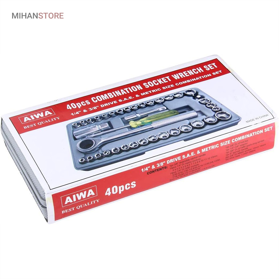این مجموعه ست کامل ابزار و آچار بکس است که یک جعبه کامل از ابزار و آچار های مختلف برای استفاده انواع خودرو سواری و مجموعه ای ارزان قیمت جهت تعمیرات در خانه و خودرو میباشد. این بکس شامل سری کامل ریز تا درشت آچار بکس 40 تکه است. این بکس دارای تبدیل بکس های 1/4 به 3/8 و اچار شمع ماشین، کمکی بکس ومناسب برای خودرو منزل موتورسیکلت میباشد. مجموعه 40 عددی آچار بکس AIWA یک ست بی نظیر از انواع مختلف آچار بکس و متعلقات آن می باشد که تمامی این اقلام ساخته شده از استیل کروم وانادیوم با روکش صیقلی و آینه ای است.به کار گیری این آلیاژ در ساخت ابزار، باعث بالا رفتن مقاومت آن ها در برابر ضربه، حرارت و فشار خواهد شد و از زنگ زدگی هم جلوگیری می کند.